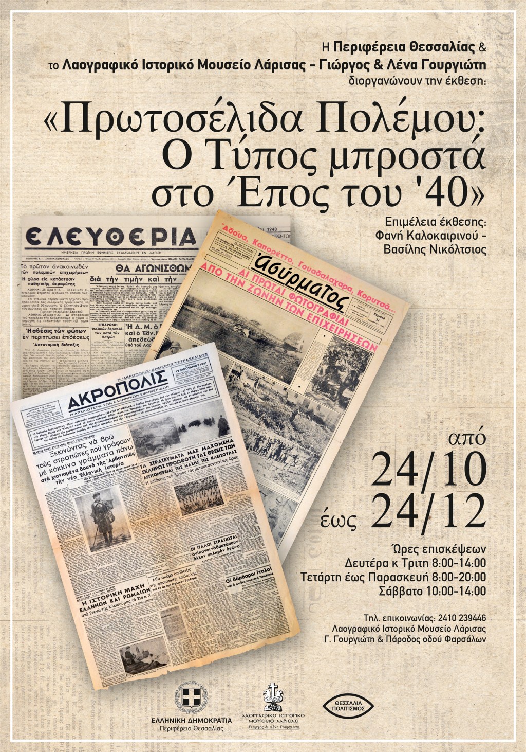 Η Περιφέρεια Θεσσαλίας συμμετέχει στον εορτασμό της εθνικής επέτειου της 28ης Οκτωβρίου και διοργανώνει σε συνεργασία με το Λαογραφικό Ιστορικό Μουσείο Λάρισας – Γιώργος και Λένα Γουργιώτη την έκθεση «Πρωτοσέλιδα Πολέμου: Ο Τύπος μπροστά στο Έπος του ΄40 », σε επιμέλεια Φανής Καλοκαιρινού – Βασίλη Νικόλτσιου.